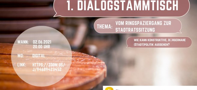 In den letzten Monaten haben viele Menschen ihren Unmut auf verschiedenste Weise ausgedrückt. Wer geht mit welchem Anliegen auf die Straße? Und wie können wir über die diffuse Artikulation von Protest, Unbehagen und Wut hinaus, Probleme lösungsorientiert ansprechen? Was braucht es, damit wir an den richtigen Orten gehört werden und mitreden können? Was muss sich verändern, damit wir uns von der Politik ernst- und mitgenommen fühlen? Das ist eines von vielen Themen, die uns in der AG Dialog bewegen. Beim Organisieren von Veranstaltungen fehlt uns meist die Zeit, unsere Inhalte selber intensiv zu diskutieren. Aus diesem Grund starten wir ein neues Format: In einem monatlichen DIALOGSTAMMTISCH wollen wir in lockerer Atmosphäre ins Gespräch kommen – jenseits von großen Veranstaltungen und zunächst ohne eingeladene Expert*innen. Wir wünschen uns, dass sich Menschen mit verschiedenen Meinungen eingeladen fühlen und wir kontrovers, aber respektvoll miteinander diskutieren können. Wir hoffen, dass wir uns bald in einem Biergarten oder einer Kneipe treffen können. Bis dahin laden wir online ein. Wir freuen auf alle, die teilnehmen und damit zu einem friedvollen Miteinander in unserer schönen Stadt und ihrem wundervollen Umland beitragen.
